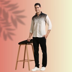 The coordinated buttons, sharp collar, and finely tailored chest pocket with signature logo enhance its premium appeal. The subtle print adds personality while maintaining a clean and sophisticated look.